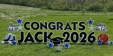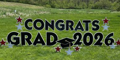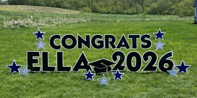 Stars in school colors, grad cap, grad's name and graphics to express grad's personality (ie. sports)